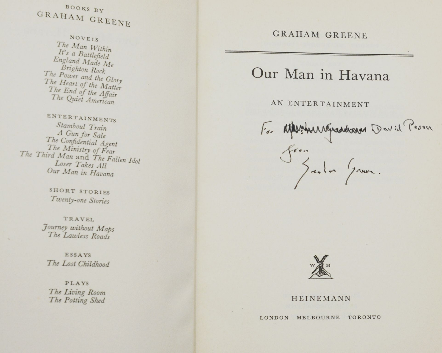 An excellent copy of one of Greene's best known works, a comic novel of espionage in Cuba. The basis of a 1959 film. Rare signed.