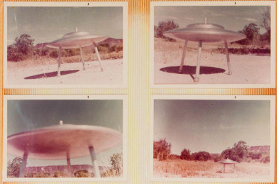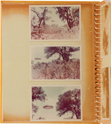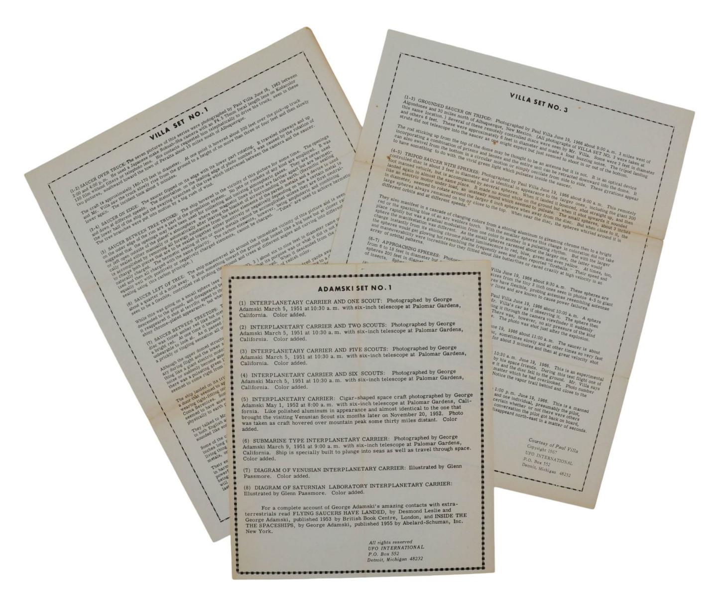 The two sets from Villa contain 7 and 13 images of flying saucers photographed around Albuquerque, NM. The caption sheet for "Villa Set No. 1" also relays details of his close encounter of the third kind, which lasted for 90 minutes: "They were very friendly and seemed to have answers to many of earth's problems. They were not superhuman but were superior mentally and physically to earth people [...] When talking to Mr. Villa they spoke in both English and Spanish (mostly Spanish.).