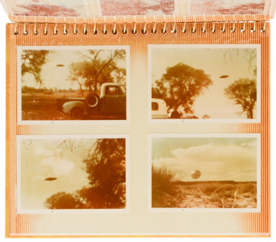 9.5x11.75" spiral-bound photo album with padded yellow covers, stiff self-adhesive sheets with plastic guards; 30 chromogenic prints and 8 silver gelatin prints, most measuring 5x3.5" though several are slightly larger. Included is one complete set of photos by George Adamski and two complete sets by Paul Villa.