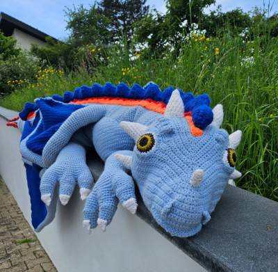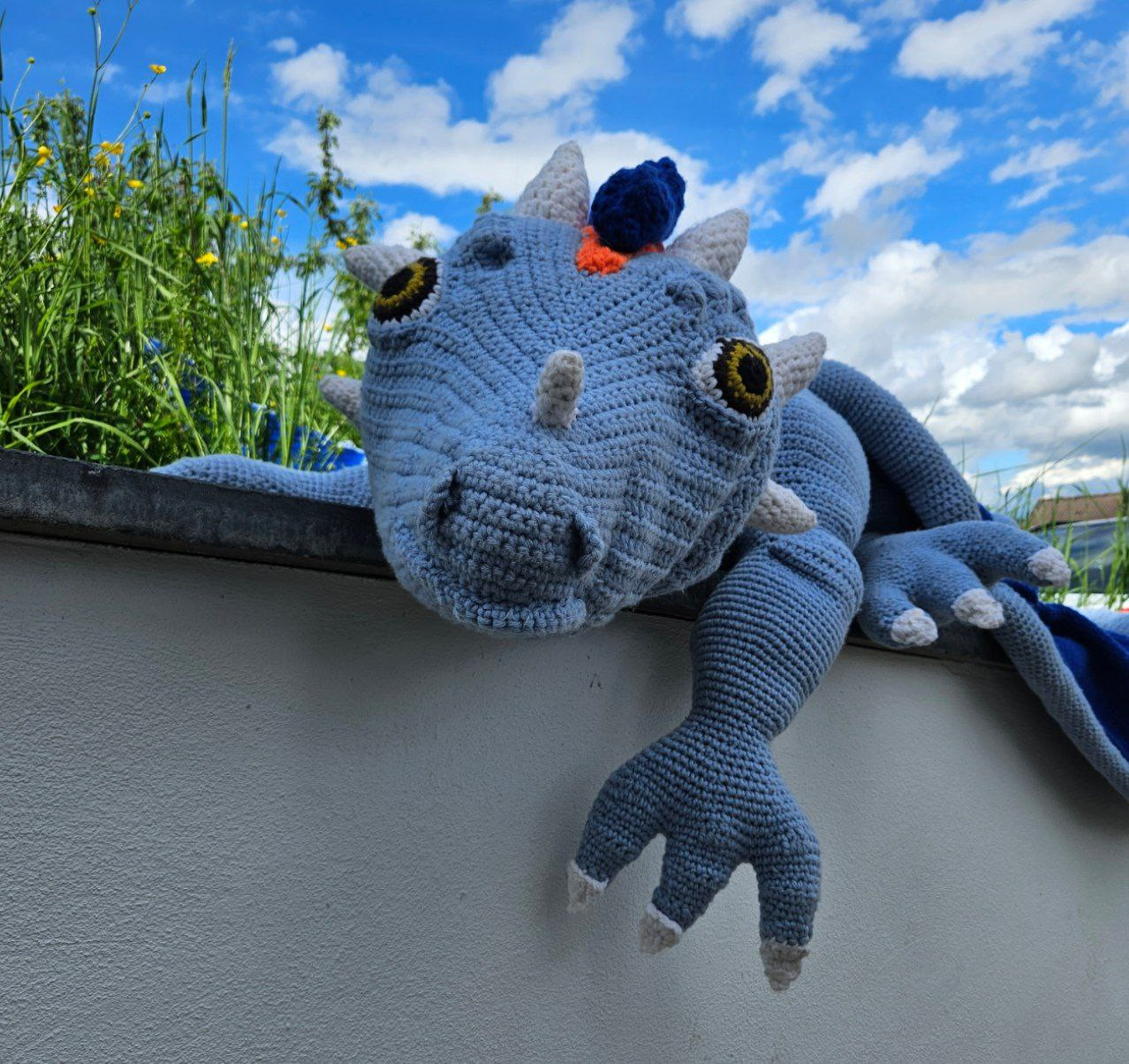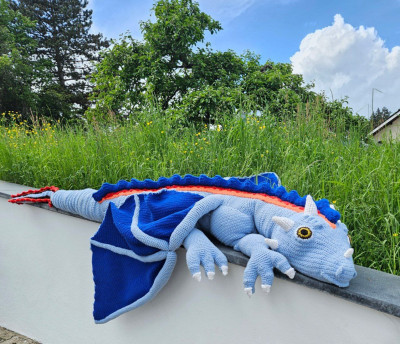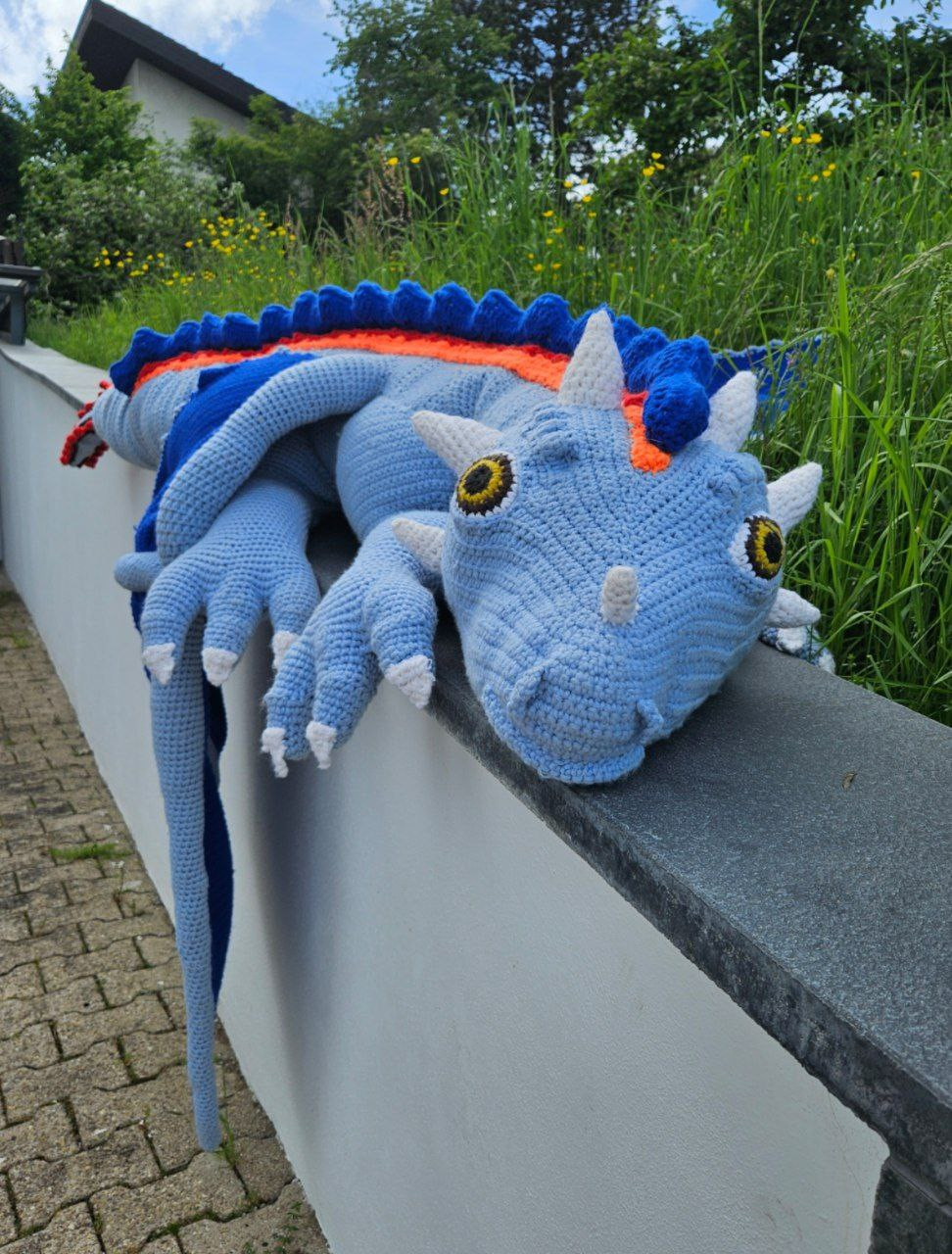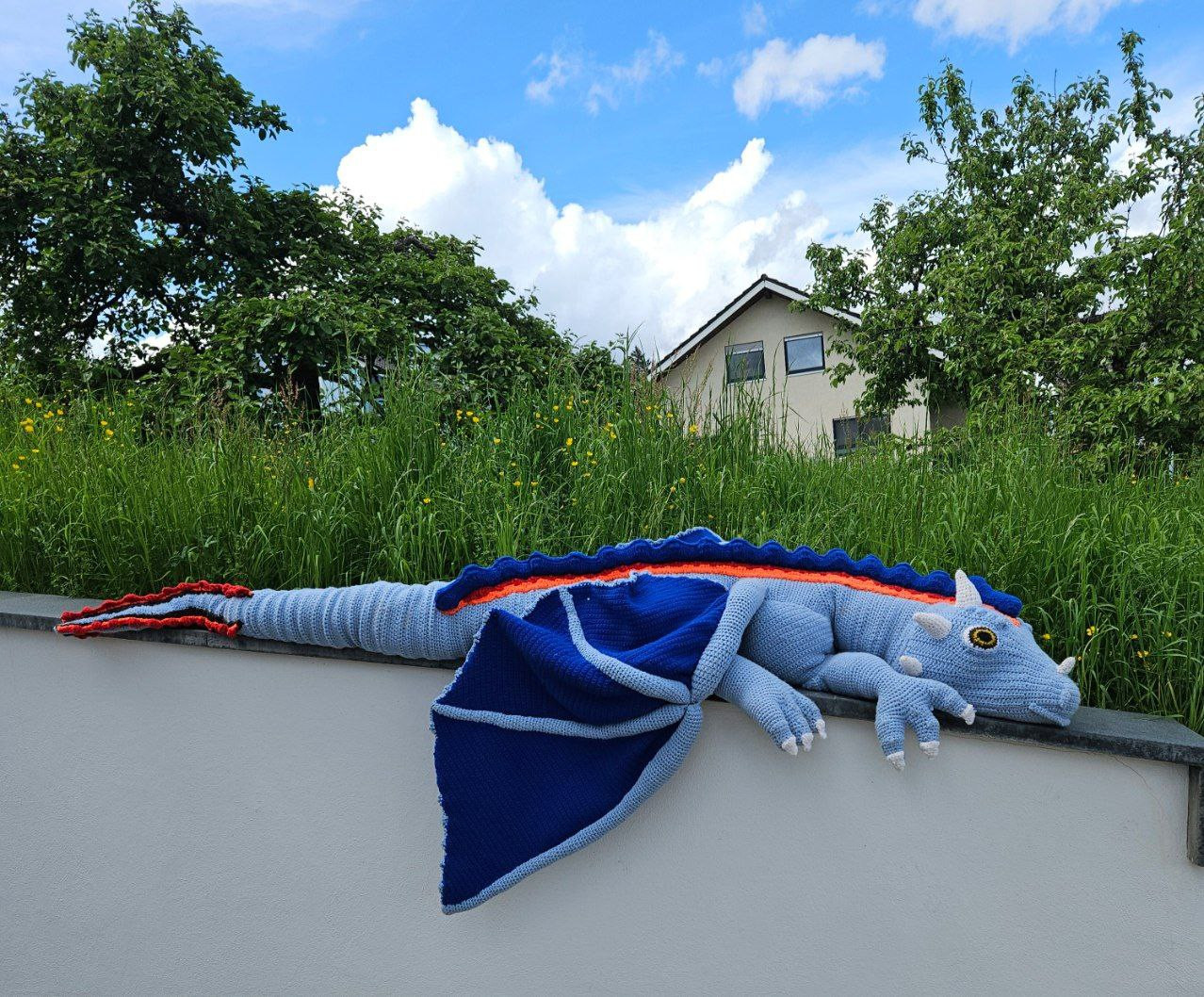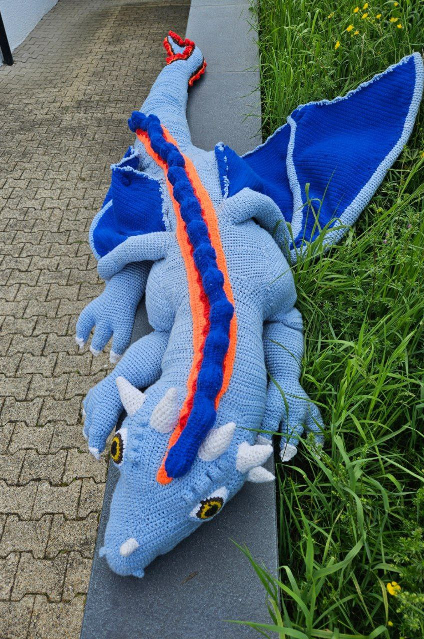 Hand-crocheted life-size dragon, 3 meters long, wingspan 3 meters, cotton fillin