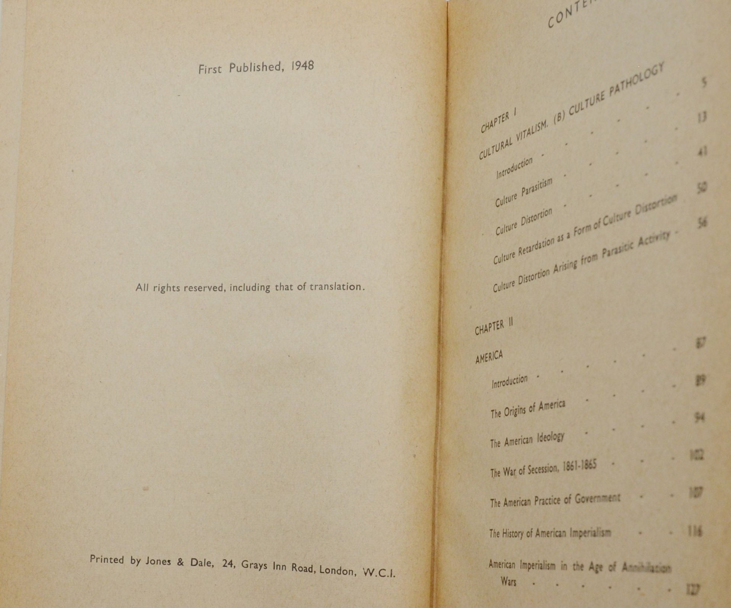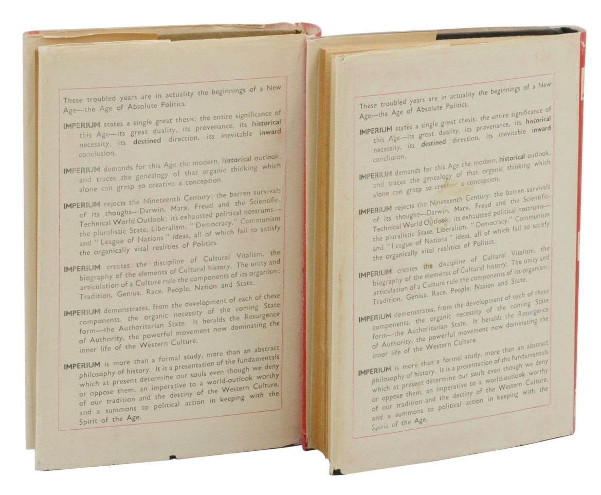 An infamous rarity amongst collectors of extremist literature, self-published, dubbed "America's Mein Kampf" by Anthony Mostrom in the Los Angeles Review of Books. It is perhaps the most theoretically-complex and oft-cited fascist work published after WWII, taking a page from Oswald Spengler more than Hitler.