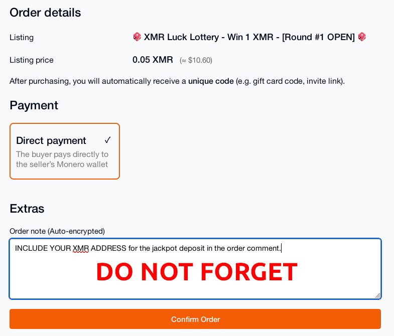3. INCLUDE YOUR XMR ADDRESS for the jackpot deposit in the order comment.