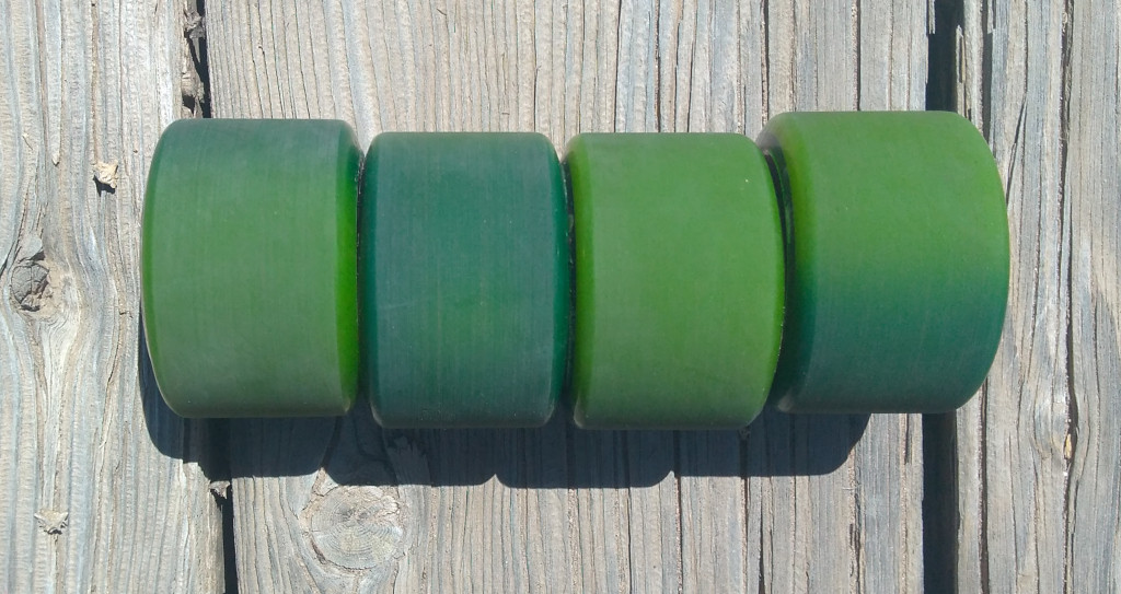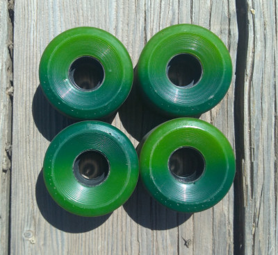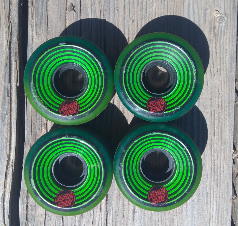 These came stock on a Santa Cruz Serape Pintail longboard cruiser complete. They're basically Slime Ball wheels, same shape and urethane, without all of the extra branding. These are excellent center-set cruiser wheels, good for a cruiser skateboard or a smaller longboard. They've been dyed a subtle two-tone that is easier to see in person. Barely broken in, there's no damage to the riding surface. All of the wear is cosmetic at this point. 60mm, 78a, wide, center set.
