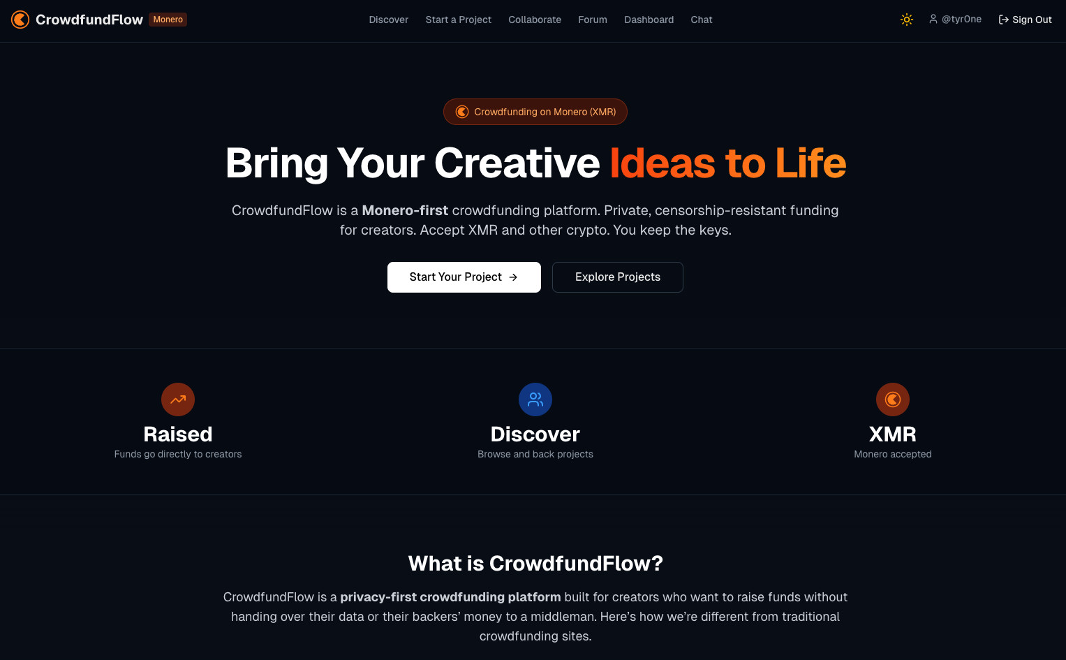 CrowdfundFlow is a crowdfunding platform built for privacy. Unlike traditional platforms, it runs on Monero (XMR) so funding is censorship-resistant and private. Creators can raise money for creative projects without exposing personal or financial details.