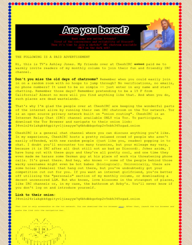 My website onion: ashley6njwcozxrs6hknlwr73dwmgmnbb4cz6ckdljuwoek7q27equqd.onion