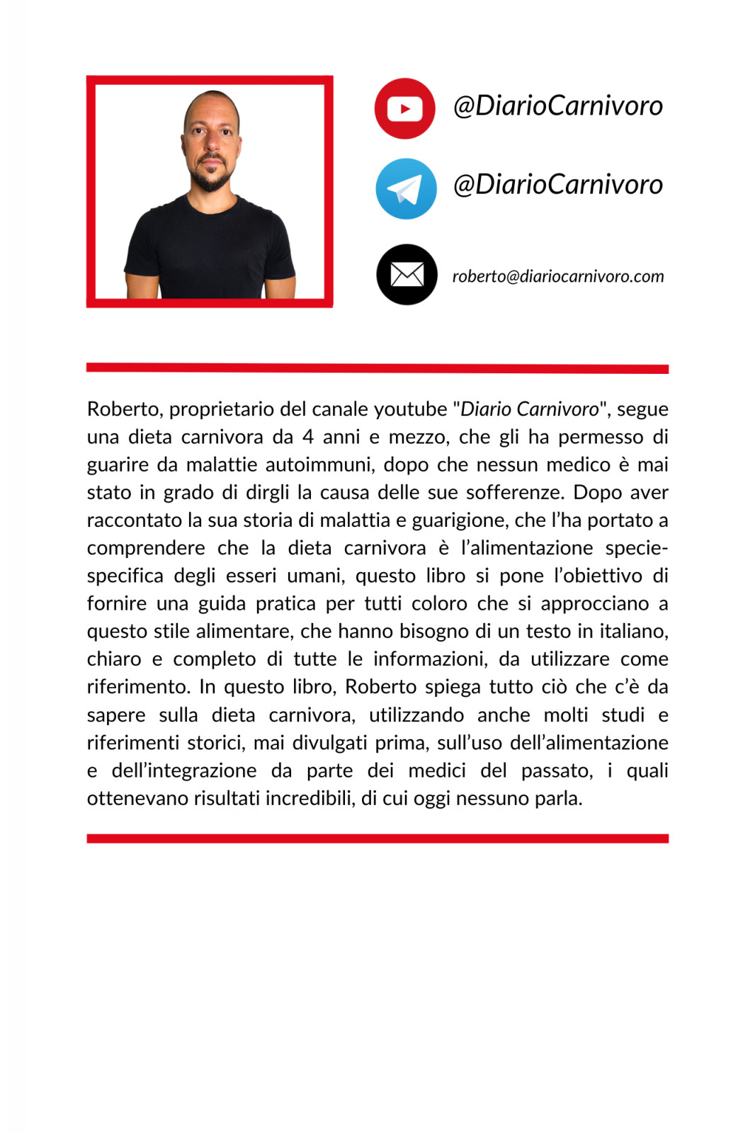 Roberto, proprietario del canale youtube "Diario Carnivoro", segue una dieta carnivora da 4 anni e mezzo, che gli ha permesso di guarire da malattie autoimmuni, dopo che nessun medico è mai stato in grado di dirgli la causa delle sue sofferenze. Dopo aver raccontato la sua storia di malattia e guarigione, che l’ha portato a comprendere che la dieta carnivora è l’alimentazione specie-specifica degli esseri umani, questo libro si pone l’obiettivo di fornire una guida pratica per tutti coloro che si approcciano a questo stile alimentare, che hanno bisogno di un testo in italiano, chiaro e completo di tutte le informazioni, da utilizzare come riferimento. In questo libro, Roberto spiega tutto ciò che c’è da sapere sulla dieta carnivora, utilizzando anche molti studi e riferimenti storici, mai divulgati prima, sull’uso dell’alimentazione e dell’integrazione da parte dei medici del passato, i quali ottenevano risultati incredibili, di cui oggi nessuno parla.