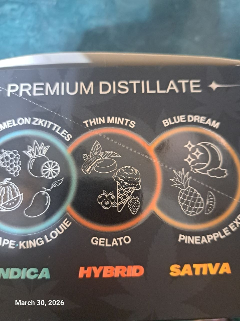 Kushmints(H), Gelato(H) , Orange Sorbet(H), King Louie(I), Mango Kush(I), Watermelon Skittles(I), Grape Ape(I),