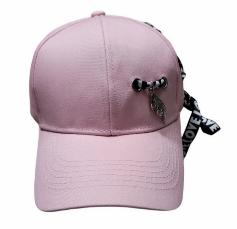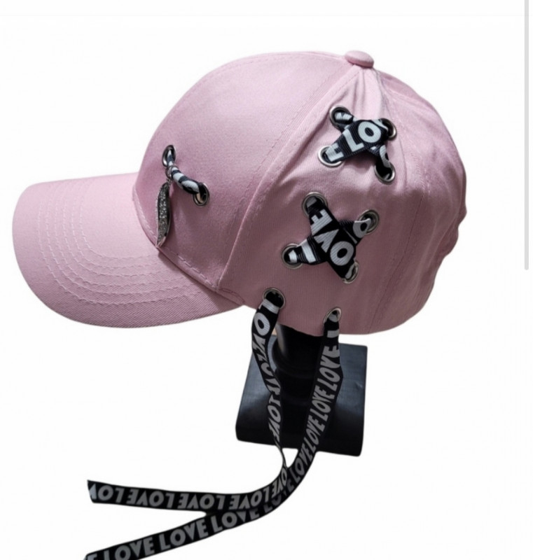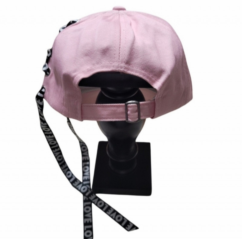 Tags: fashion hat, pink cap, adjustable hat, statement piece, edgy fashion, decorative straps, LOVE design, leaf charm, trendy cap, casual wear, unique style, XMR Bazaar, monero-friendly.