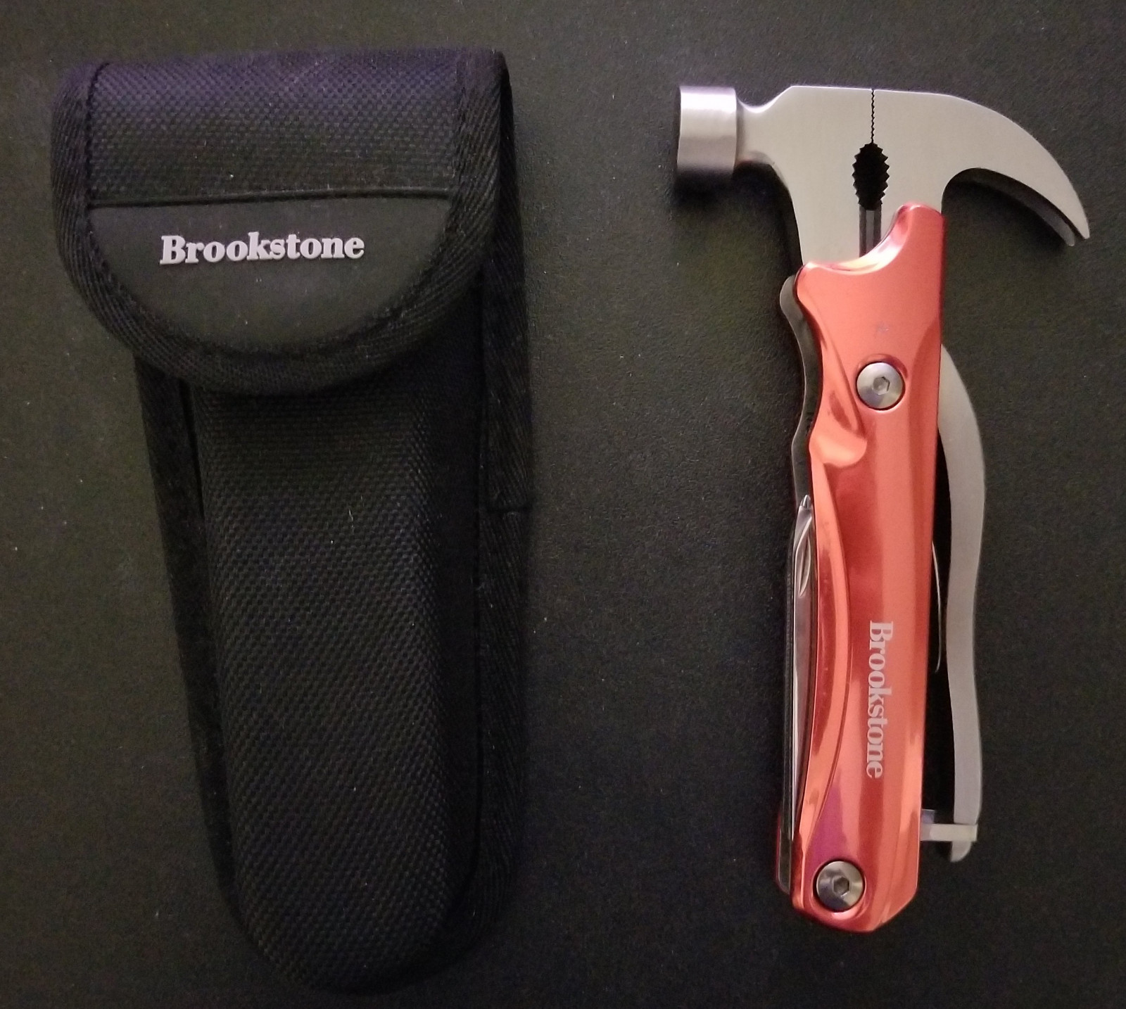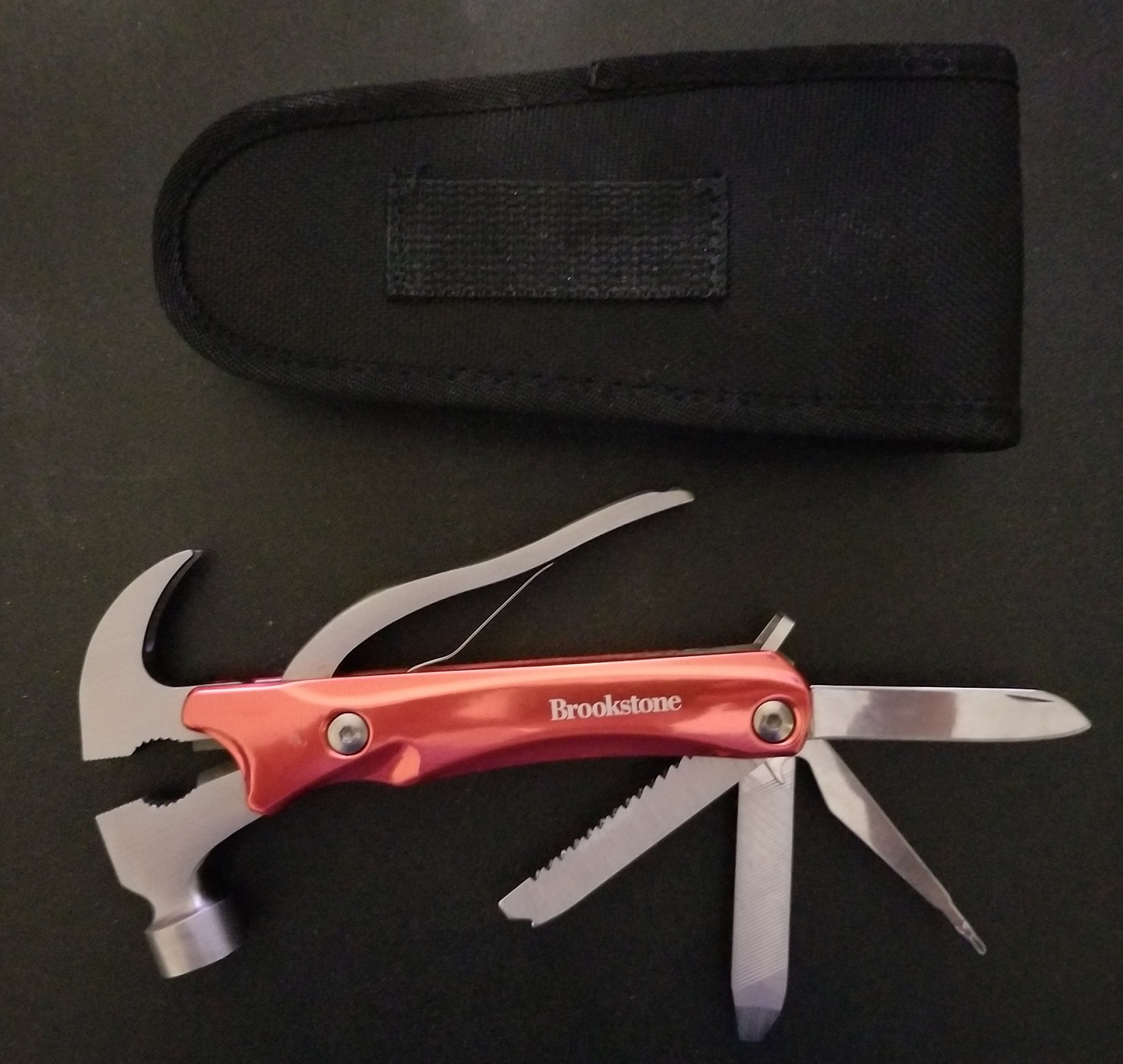 A metal multi-tool with carrying case. Includes hammer, pliers, saw, file, Phillips screwdriver, and knife. Basically new, no scratches.