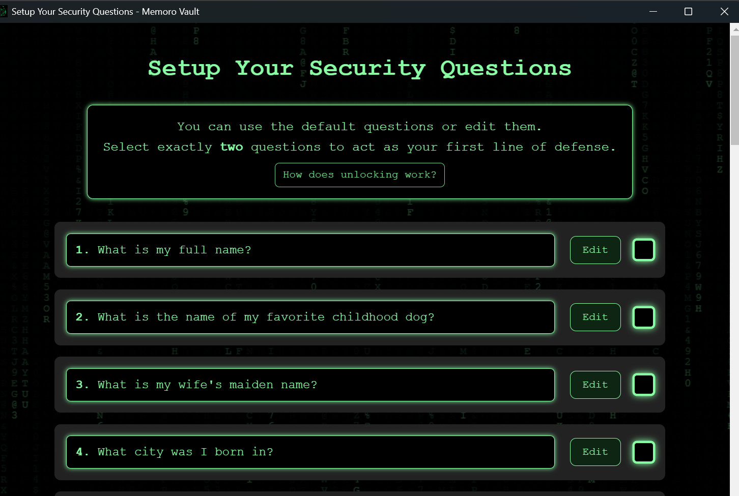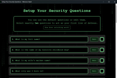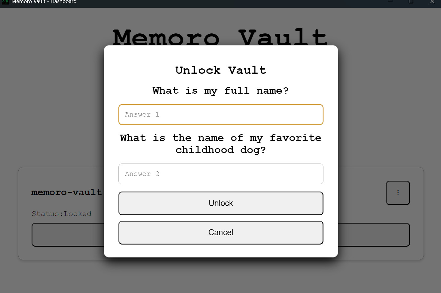 Memoro Vault is an offline, memory-based encryption system for securing digital files without reliance on servers, accounts, or recovery services. Access is determined by verifiable knowledge. All operations occur client-side, and nothing is stored or transmitted externally.
