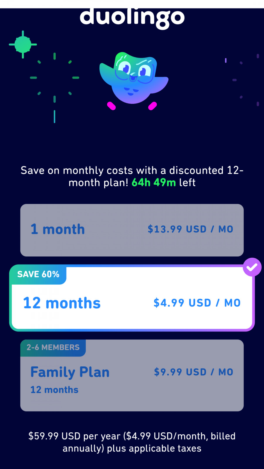 Step up your language learning game with a Duolingo Super membership! No more ads, Unlimited hearts, Personalized practice, and free Legendary challenges!
