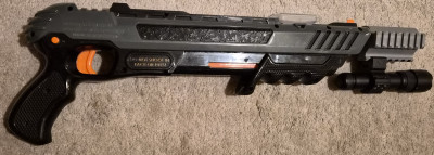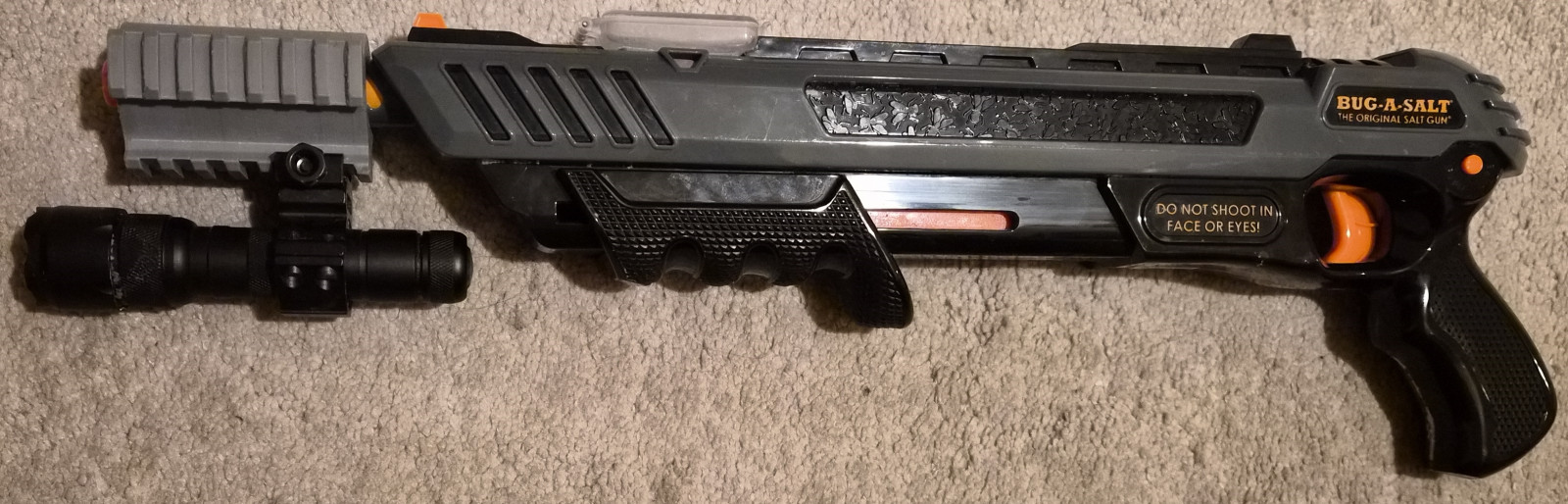 Shoots salt to kill bugs. Includes rail and 1000 lumen flashlight.