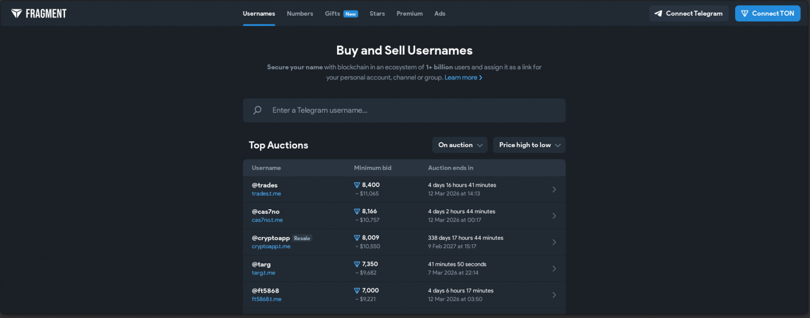 Fragment.com is an official blockchain marketplace connected to Telegram and built on the Toncoin network.