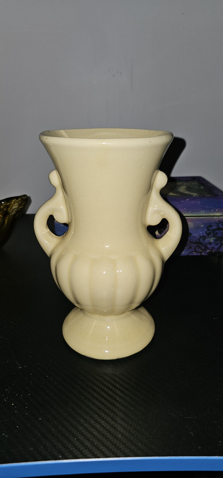 This vase was likely crafted in the 1940's. No markings at all. Excellent condition save for a barely noticeable chip on the rim (pictured). Like almost all uranium glazed pieces, it glows green under a 365nm UV light, NOT a 395. Not food safe.