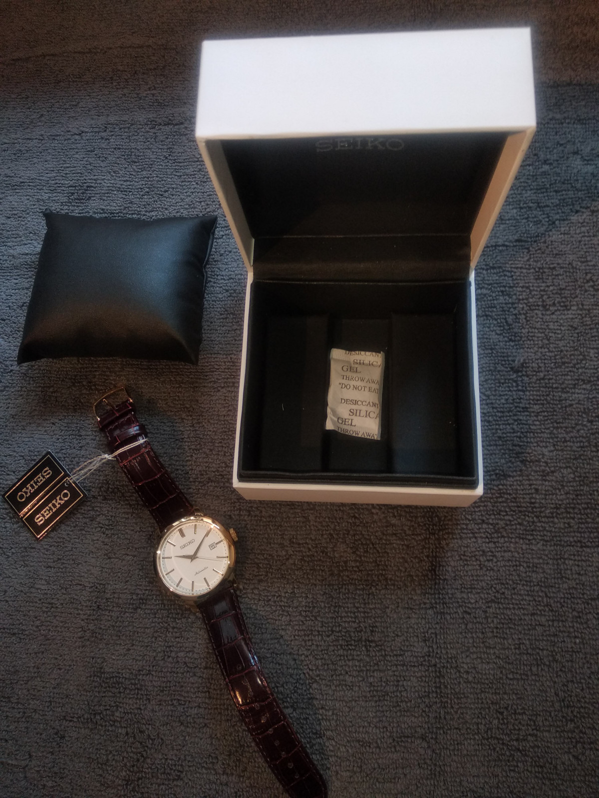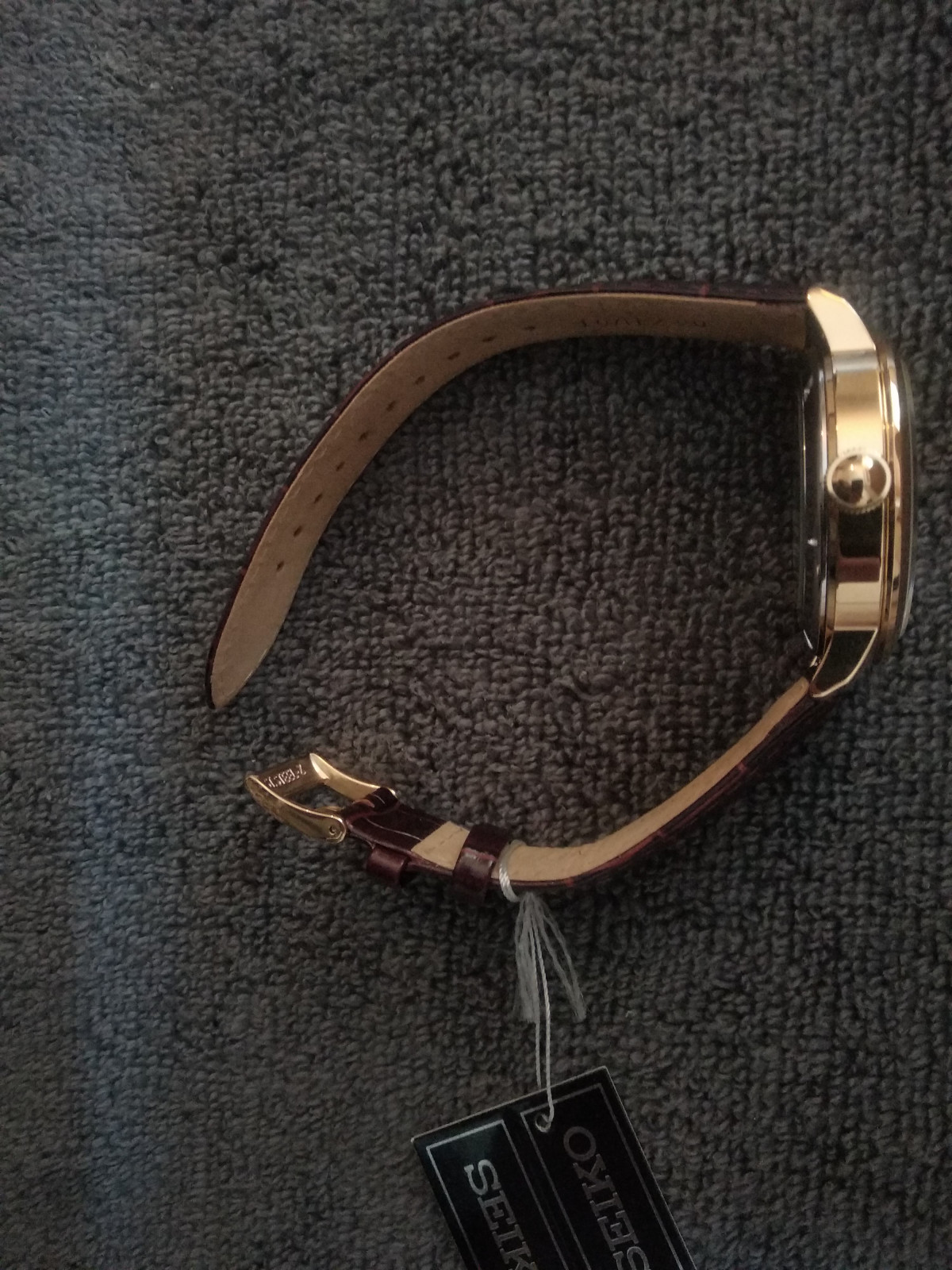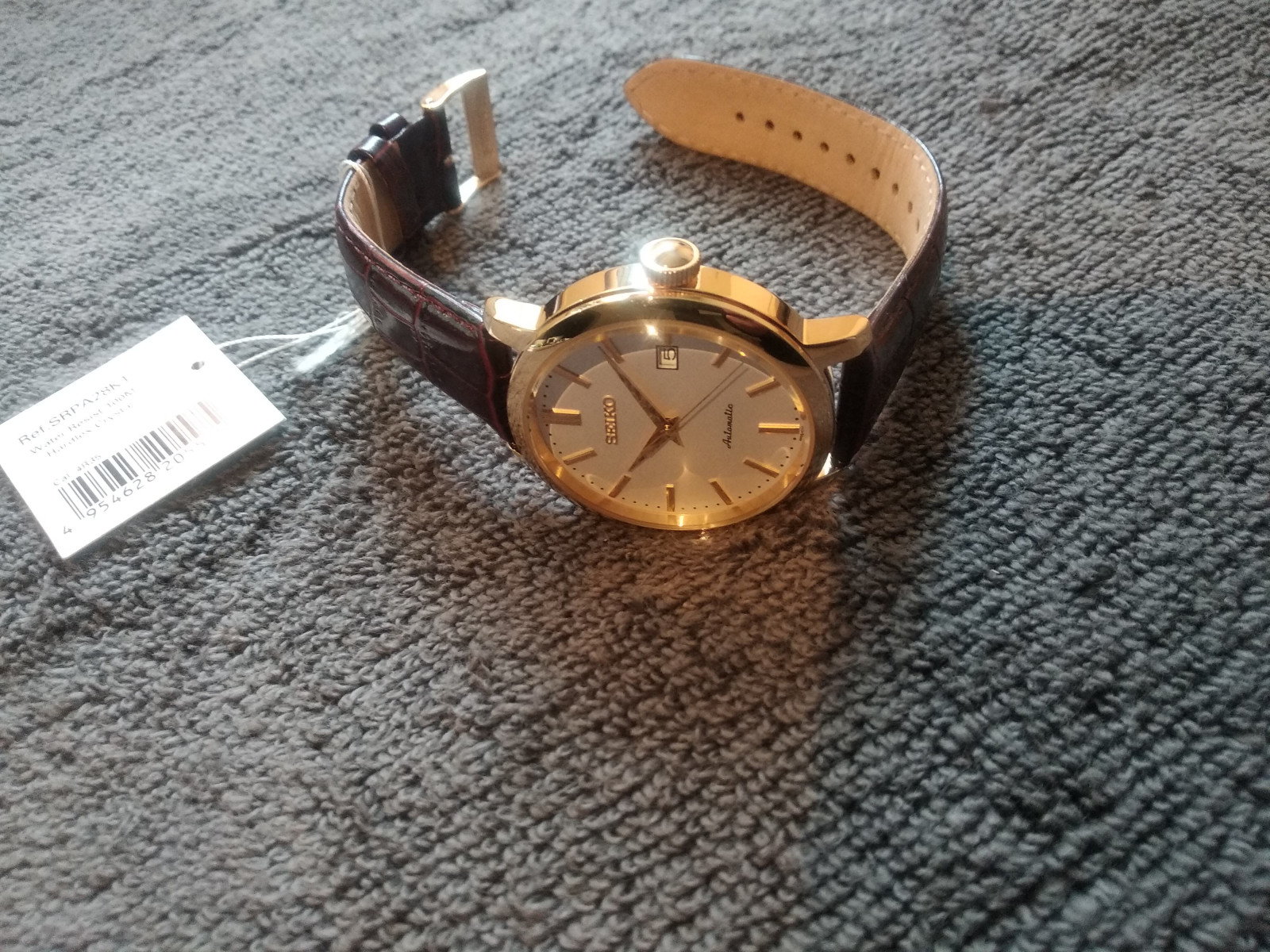 Crafted for both style and precision, the Seiko srpa28 wristwatch combines a classic aesthetic with modern mechanical (automatic) movement with 100mtr wr . The white dial, framed by a sleek Gold tone stainless steel case, exudes a timeless elegance, while the brown leather strap offers comfort and durability for everyday wear. Unisex in design, this watch is as versatile as it is sophisticated, making it a superb choice for anyone who appreciates the blend of traditional craftsmanship and contemporary functionality. Whether dressed up for a formal event or paired with casual attire , the Seiko srpa28 is a testament to refined taste and watchmaking excellence. International shipping available, costs are determined on a case-by-case basis. Im always happy to you, thankyou for your interest 😃