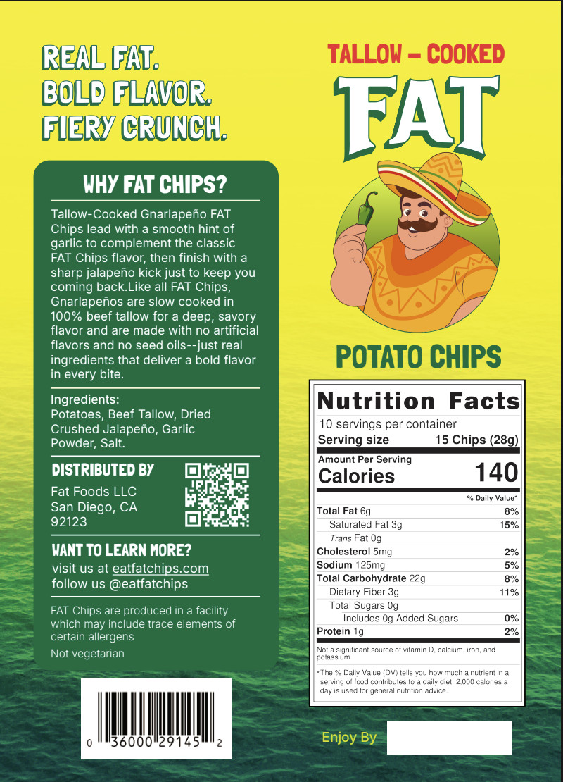 The perfect blend of smooth Garlic and spicy Jalapeño complement the original FAT Chips flavor. As always, crunchy and perfectly cooked in small batches with 100% pure beef tallow, russet potatoes, garlic powder, dried crushed jalapeño, and sea salt. Gnarly party size is enough for 10 servings!