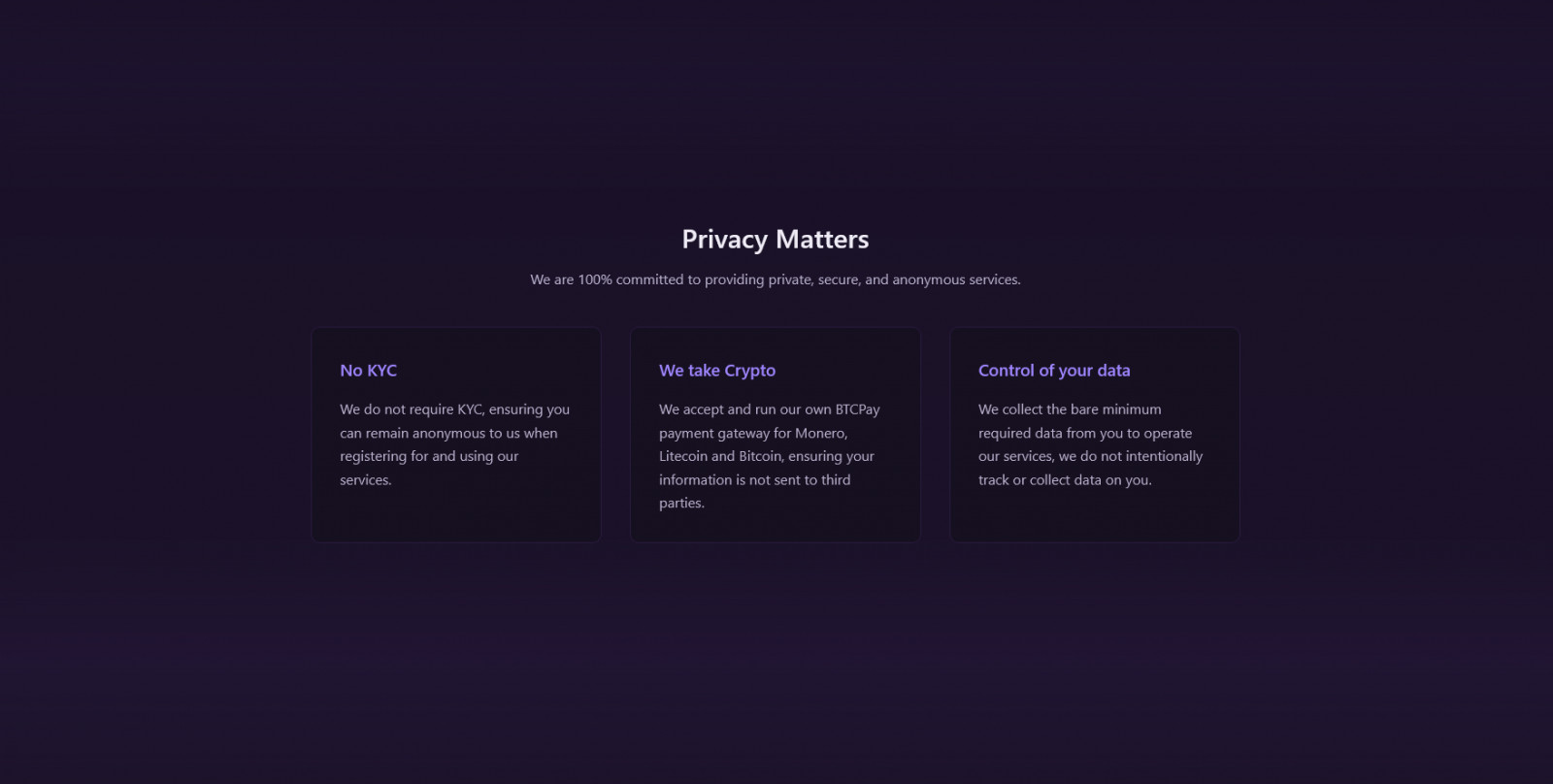 No Third Party Payment Processor - We run BTCPay to accept XMR, LTC and BTC directly.