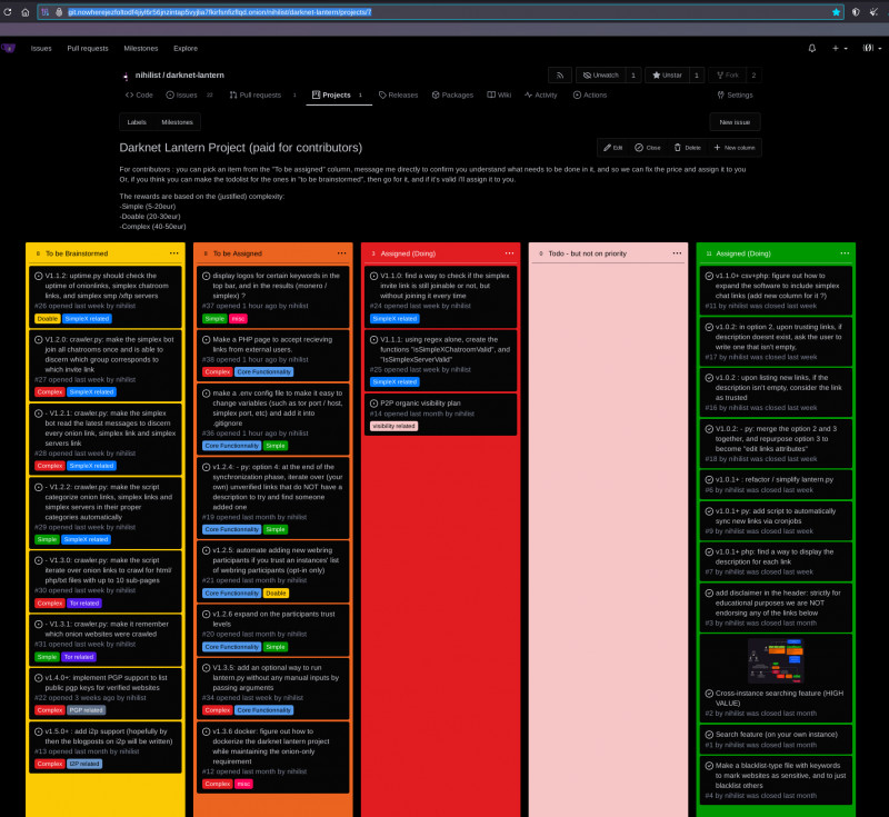 The gitea repository for contributions is here: http://git.nowherejezfoltodf4jiyl6r56jnzintap5vyjlia7fkirfsnfizflqd.onion/nihilist/darknet-lantern