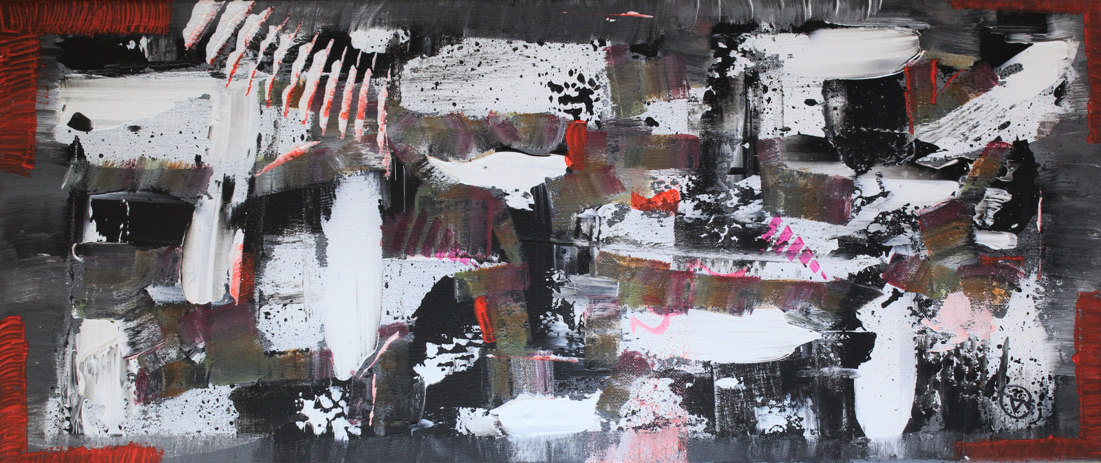 This original abstract acrylic painting explores the tension between chaos and structure through a bold interplay of color, texture, and gesture. Dominated by deep blacks, greys, and whites, the composition is energized by striking accents of red and subtle touches of pink, creating a dynamic visual rhythm across the canvas.