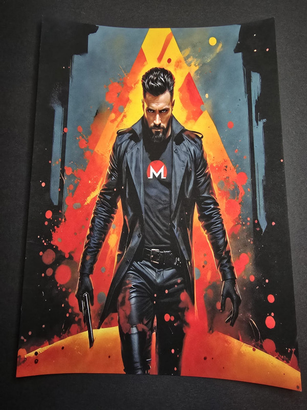 A bold and striking art print featuring a mysterious, intense character in a black leather coat, standing against a powerful backdrop of fiery red and orange splashes. The figure exudes strength and determination, with a sleek modern look, gloves, and a weapon in hand. The Monero (XMR) logo on his shirt adds a crypto-inspired touch, making this an ideal piece for fans of digital art, cryptocurrency, and cyberpunk aesthetics. This high-quality print is perfect for modern interiors, gaming rooms, or collectors of unique artwork.
