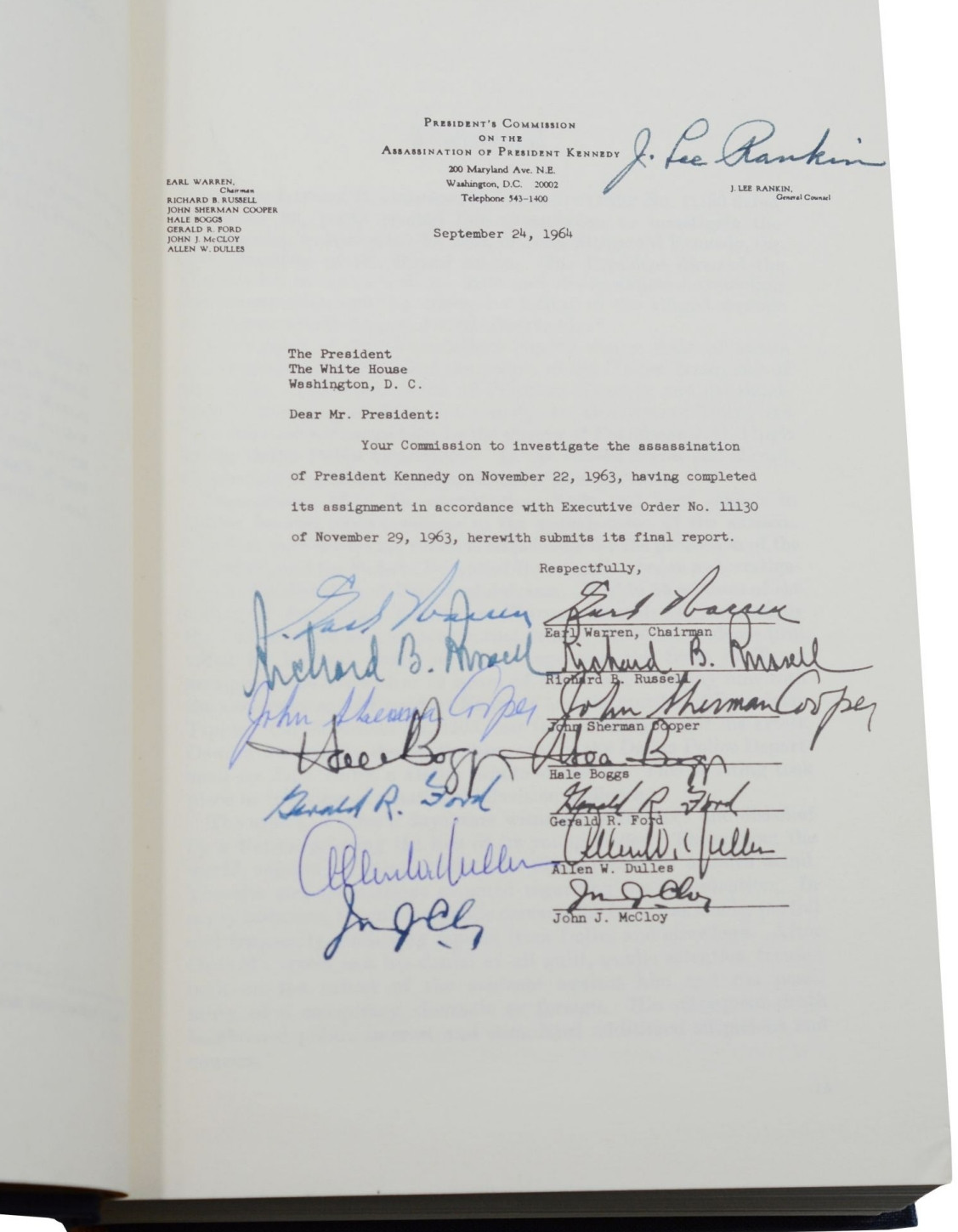 First edition. Signed by all seven members of what is popularly known as The Warren Commission: Supreme Court Justice Earl Warren, Richard B. Russell, John Sherman Cooper, Hale Boggs, future president Gerald R. Ford, ex-CIA chief Allen Dulles, and John J. McCloy with General Counsel J. Lee Rankin's signature in the upper margin as well. Appears to have been John J. McCloy's copy or gifted at his request as a small printed card with his name on it is laid in to the book.