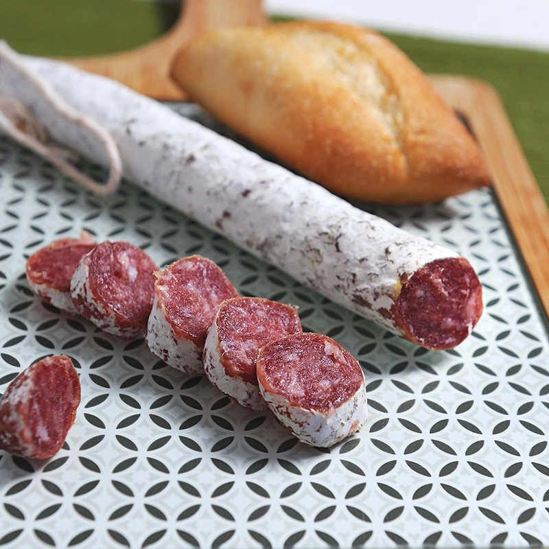 Discover an authentic Catalan delicacy with this premium espetec, a traditional cured sausage known for its naturally sweet, mild flavor and its unmistakable white edible mold, which gives it its iconic aroma and depth.