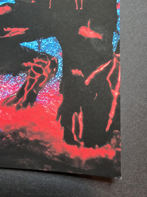 A terrifyingly captivating art print featuring an eerie apocalyptic zombie scene. The artwork depicts a dark, abandoned urban environment, illuminated by an ominous mix of red and blue neon lighting, enhancing the sinister atmosphere. The grotesque, skeletal zombies with glowing red eyes emerge from the shadows, creating an intense and horror-filled visual experience. Perfect for fans of horror, post-apocalyptic themes, and dark fantasy art, this high-quality print makes an ideal addition to gaming rooms, Halloween decor, or horror art collections.