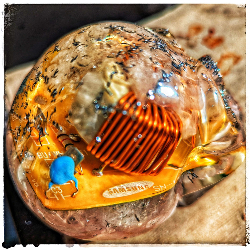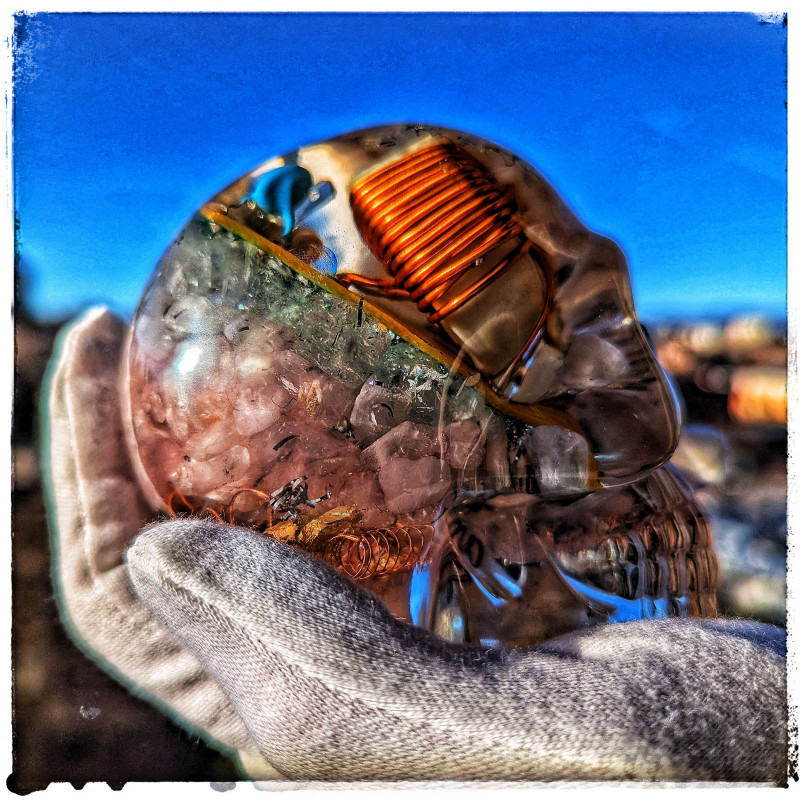 Cyber orgonite is my own creation. I incorporate parts from upcycled electronics. this skull has a circuit board from an old amplifier that says SAMSUNG on it. It has a clearly visible ceramic fuse that is blown. Consider the concept of "blowing a fuse inside your head"! Also the copper coils in the bottom are salvaged electric wire from and old warehouse we remodeled, I stripped and coiled the wire by hand.