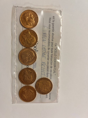 Offered for sale: Six (6) original Belgian Gold 20 Francs coins issued under Leopold II.