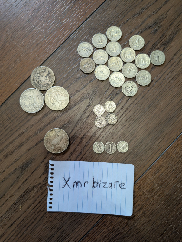 16 quarters 3 morgan dollars 4 dimes 4 mercury dimes and 1 peace dollar.