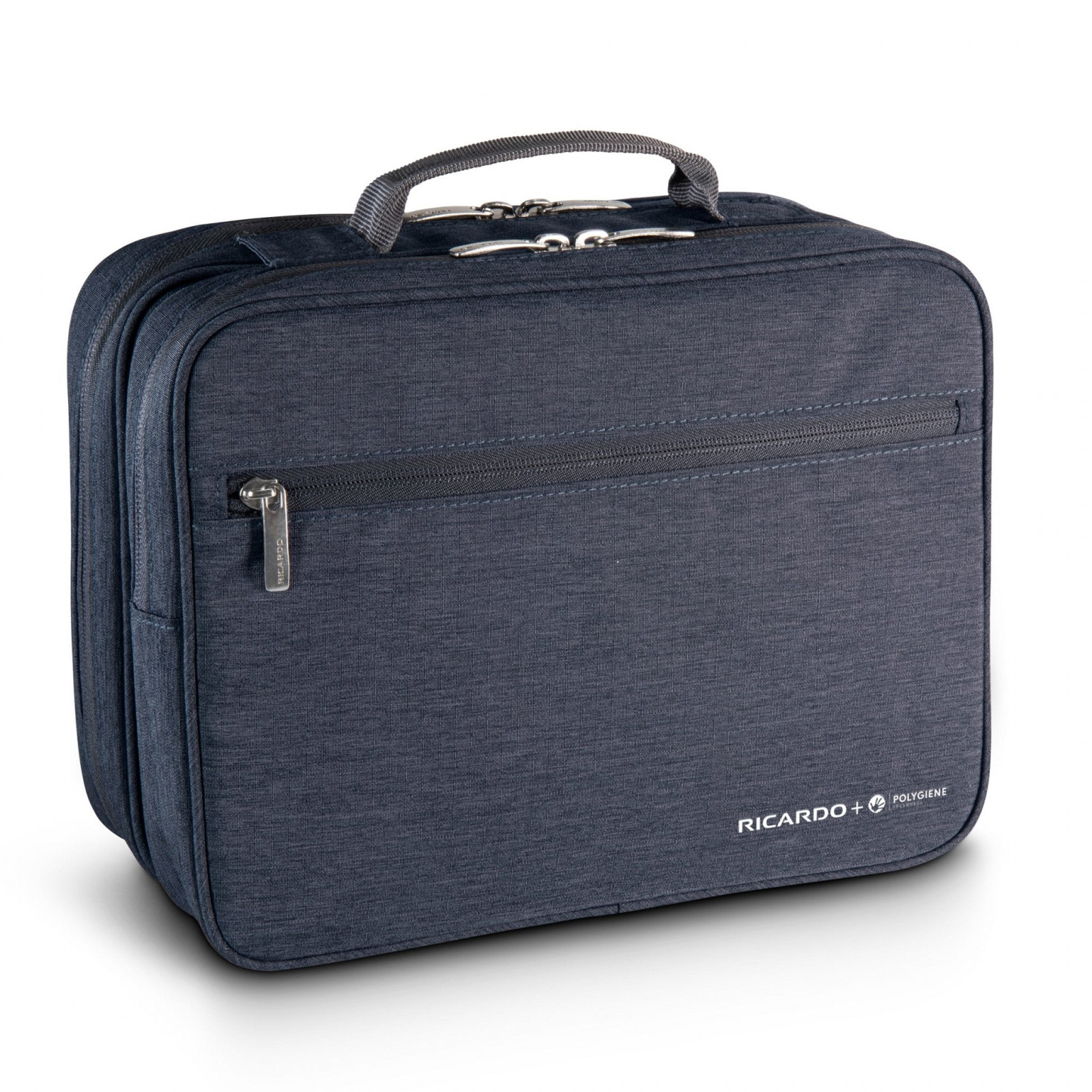 A double zipper opens separate and roomy PVC-lined wipe-clean compartments. On one side, there’s a general-purpose compartment for larger/damp items with an exterior pocket. The other side opens completely to reveal a divided zippered pocket, two elastic bands with stitched dividers and big, pleated stash pockets beneath a metal hanging hook help maximize available counter space (there is never enough). Our next generation of essentials is now created with Polygiene StayFresh™ technology, an industry-leading antibacterial technology that inhibits the growth of odor-causing bacteria.