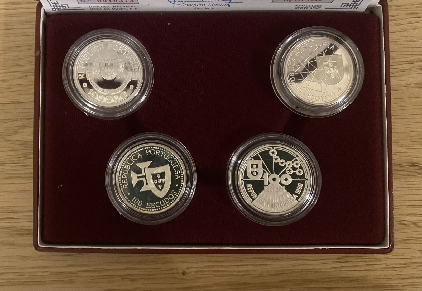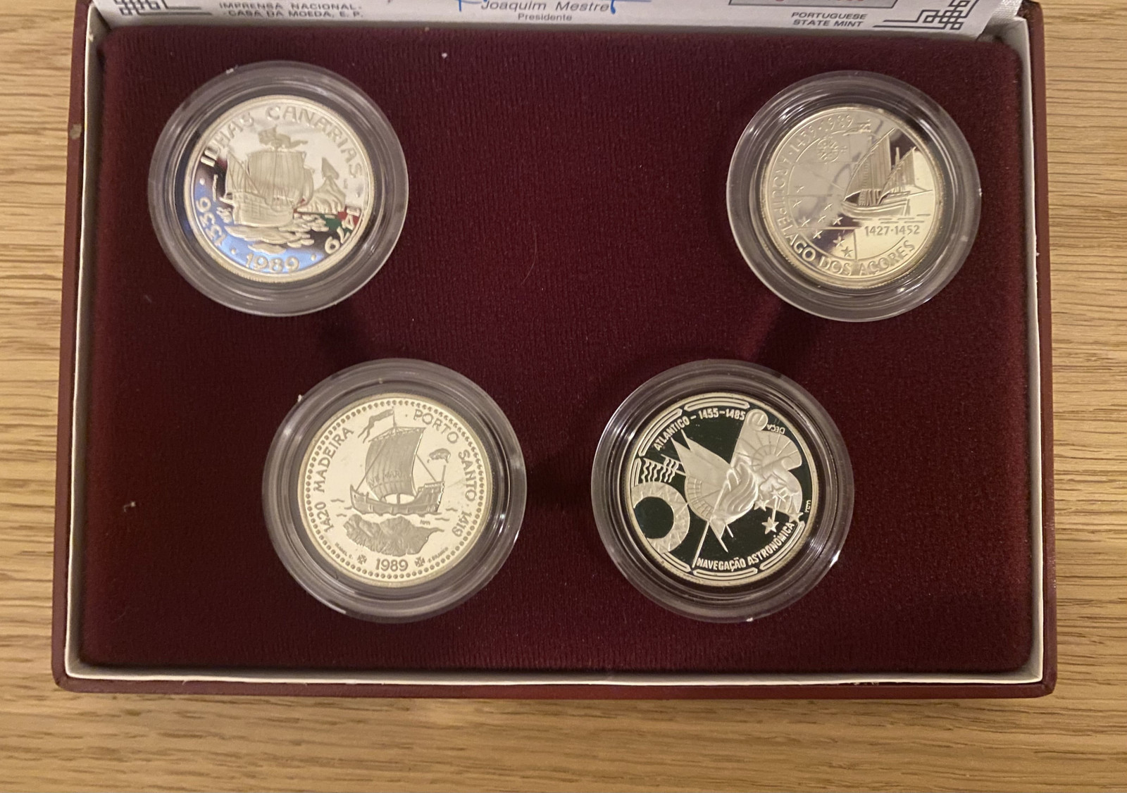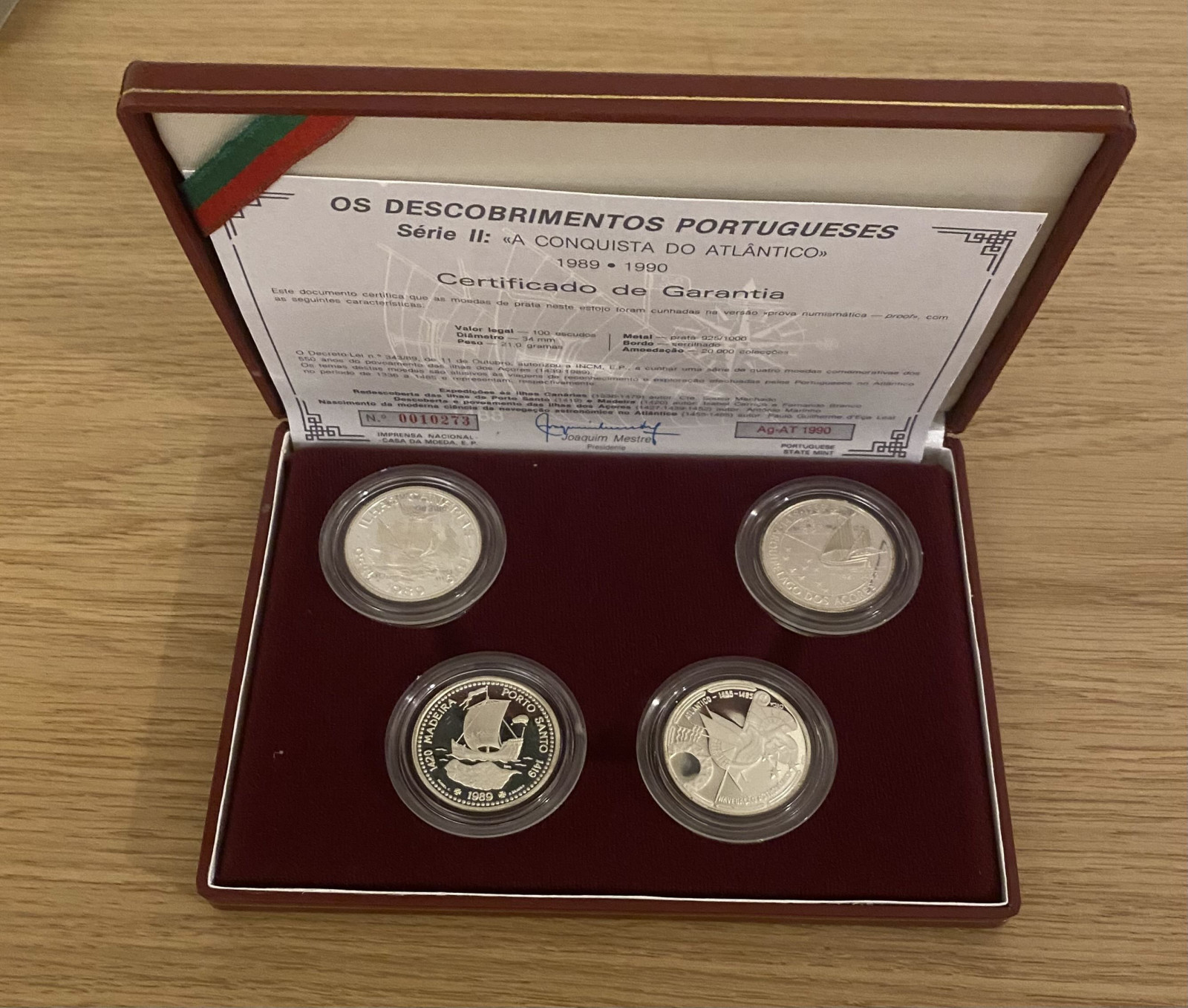 II Série dos descobrimentos Portugueses em Prata PROOF 1989 -1990, 4x moedas 100$00 Prata 925%, "A Conquista do Atlântico", (Conjunto completo), World Coins Portugal KM PS9