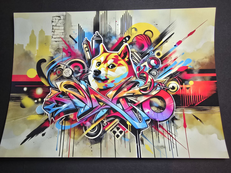 A vibrant and dynamic art print featuring a striking fusion of graffiti-style lettering and the iconic Doge meme. This unique piece blends street art, abstract expressionism, and pop culture, resulting in a visually explosive composition. Bold colors, energetic brush strokes, and intricate details make this artwork perfect for modern interiors, street art lovers, and crypto enthusiasts. A true eye-catcher for anyone who appreciates urban aesthetics and digital culture.