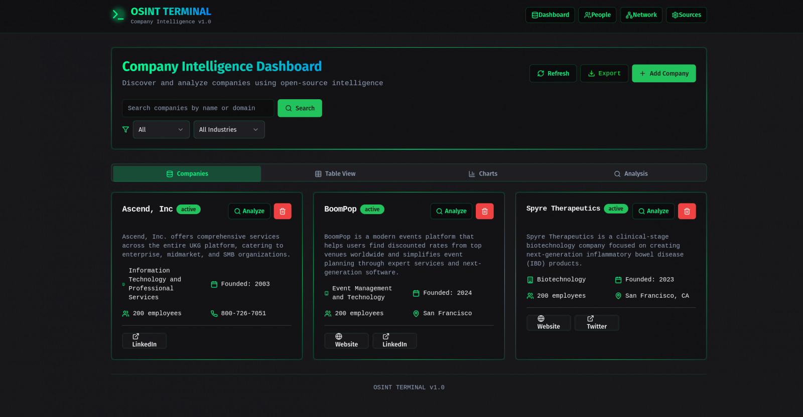 Tags: OSINT, intelligence, company research, AI automation, business intelligence, LinkedIn scraper, employee finder, sentiment analysis, network visualization, data mining, web scraping, company profiles, social media discovery, competitive intelligence, lead