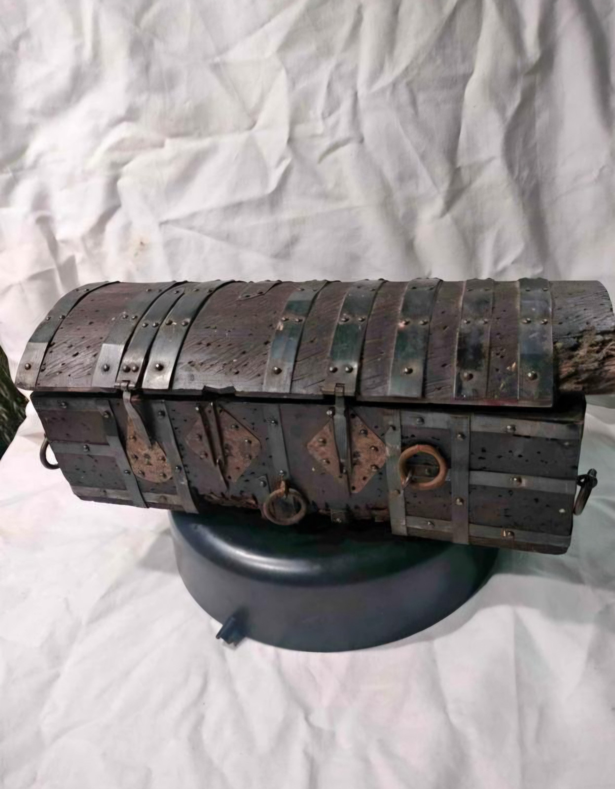 • Made of aged wood with iron reinforcements and decorative hardware