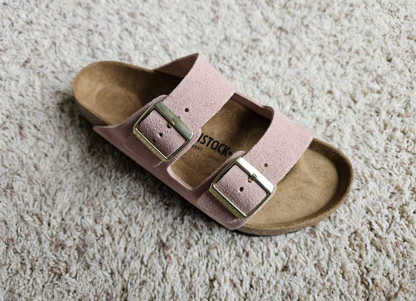 New never warn Birkenstock Arizona BS in Light Rose with gold buckles. The size is a 39 normal width but the chart is went off makes this sandal way too big. I would say this is more of a US ladies 8.5-9 and a us men's 10. But do your own research.