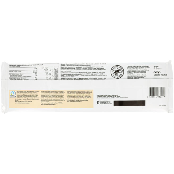 This exquisite milk hazelnut Swiss chocolate is made with real hazelnuts, Swiss milk and select cacao (>31%). It is both Rainforest Alliance certified and Fair Trade Max Havelaar certified and, of course, free of palm oil. This fine chocolate comes in a large and economical 400g pack that snaps into delicious pieces with a rich and smooth flavor of hazelnuts, Swiss milk and fine cacao. Of course, it also makes a great gift.