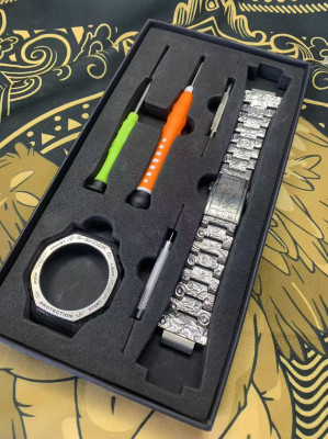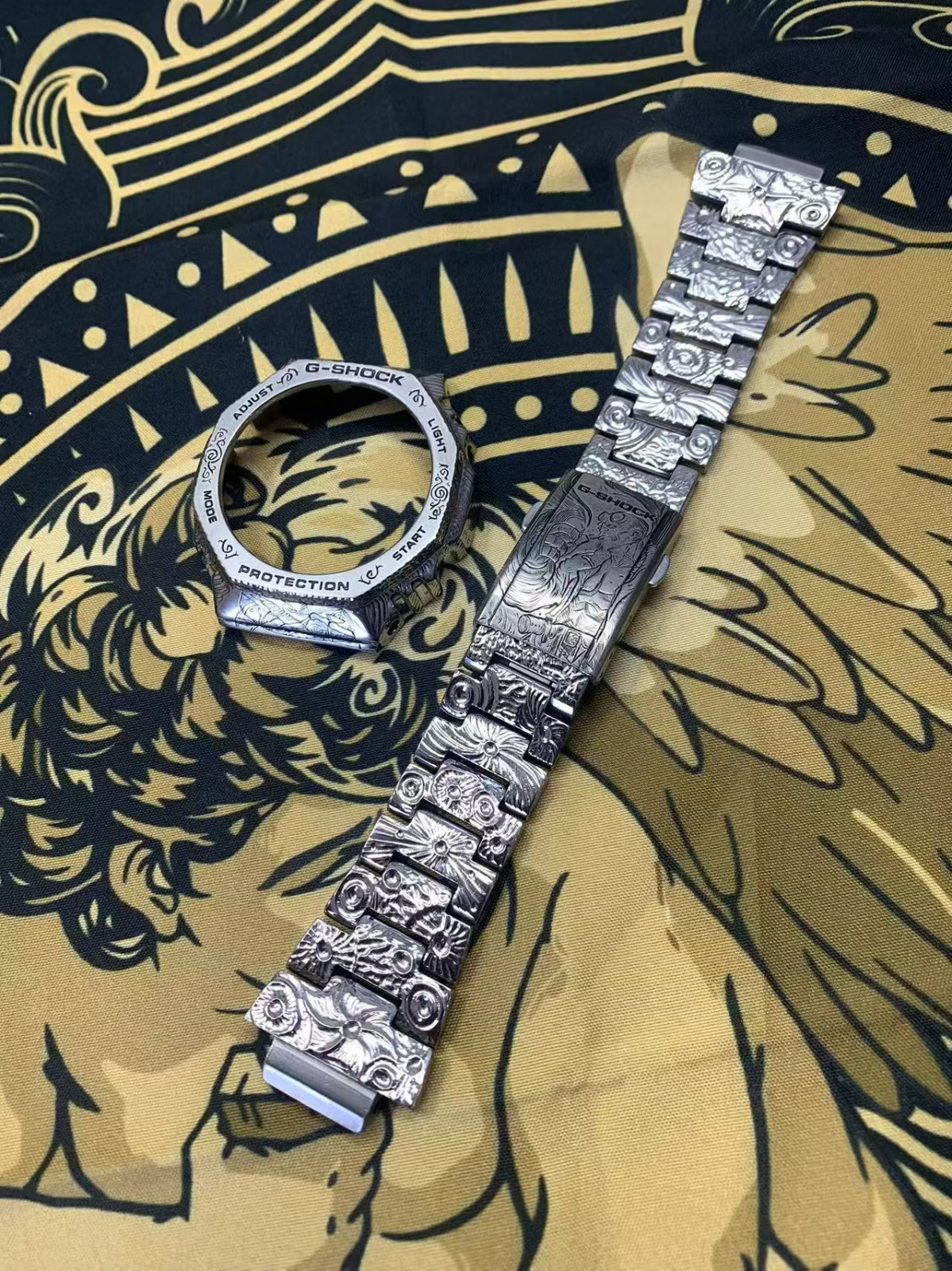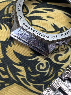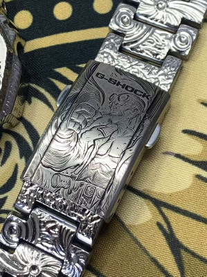 Casio 2100 "Farmhouse Oak" model, titanium case and bracelet, hand-engraved strap, custom engraving.