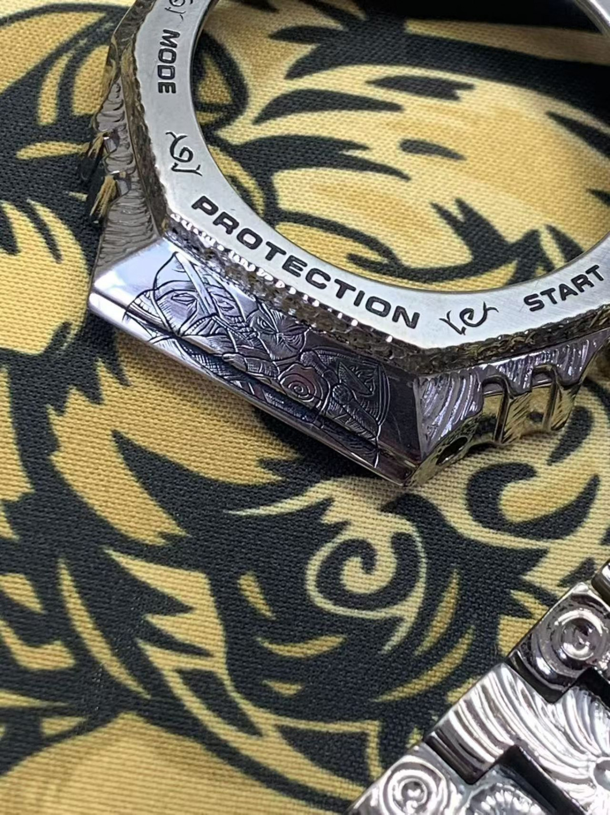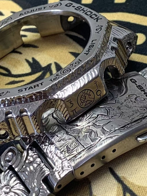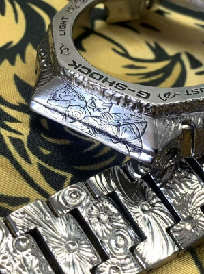 Tags: Casio 2100 "Farmhouse Oak" model, titanium case and bracelet, hand-engraved strap, custom engraving.