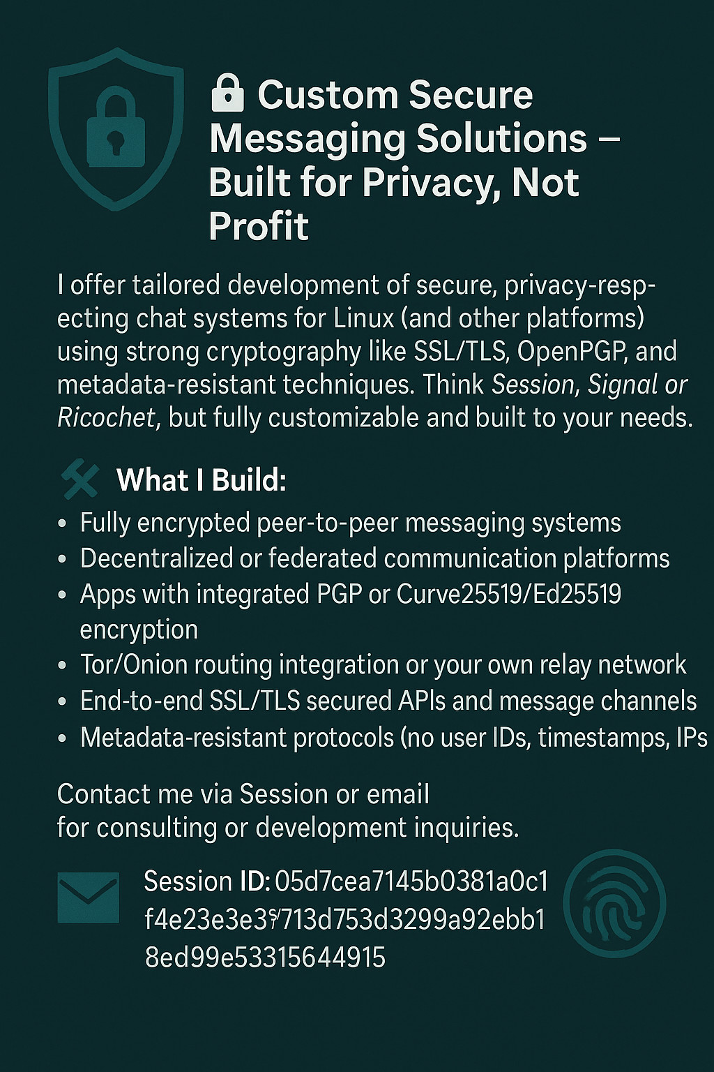 I offer tailored development of secure, privacy-respecting chat systems for Linux (and other platforms) using strong cryptography like SSL/TLS, OpenPGP, and metadata-resistant techniques. Think Session, Signal, or Ricochet, but fully customizable and built to your needs.