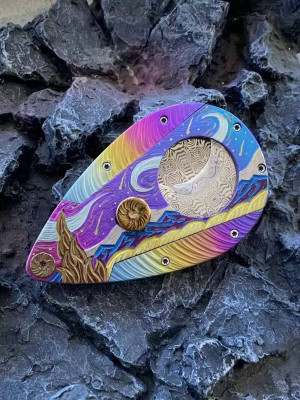 Cigar cutter, made of Damascus steel and hand-carved from titanium alloy.